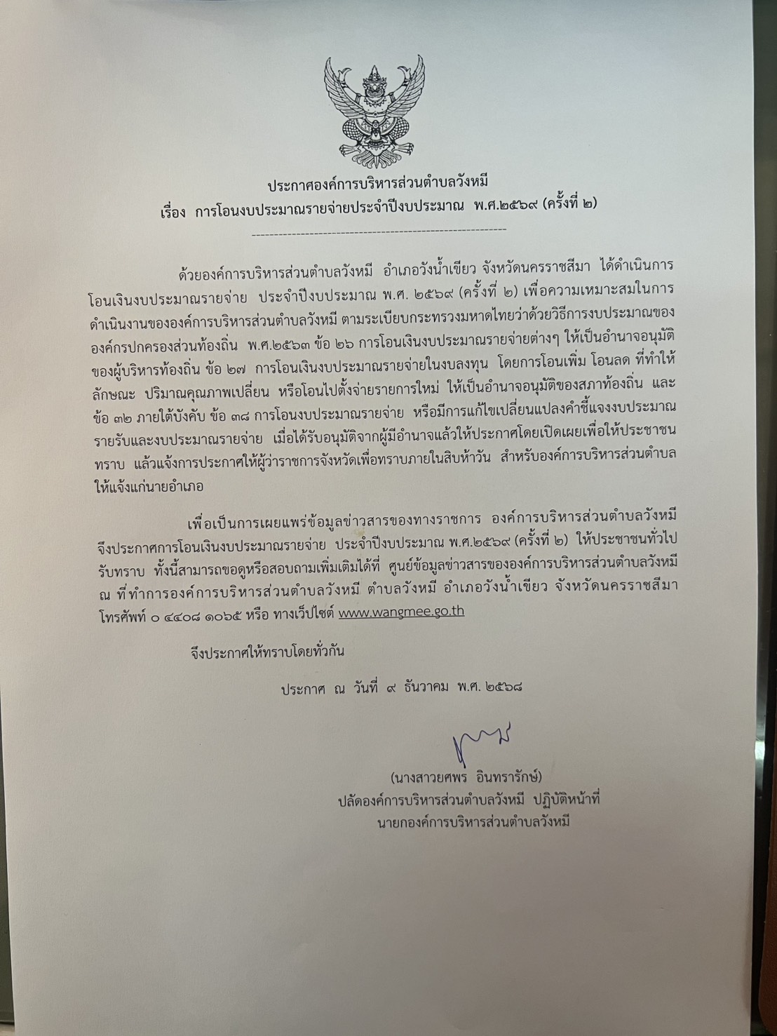 ประกาศองค์การบริหารส่วนตำบลวังหมี เรื่อง การโอนเงินงบประมาณรายจ่ายประจำปีงบประมาณ พ.ศ.2569 ครั้งที่ 2 |