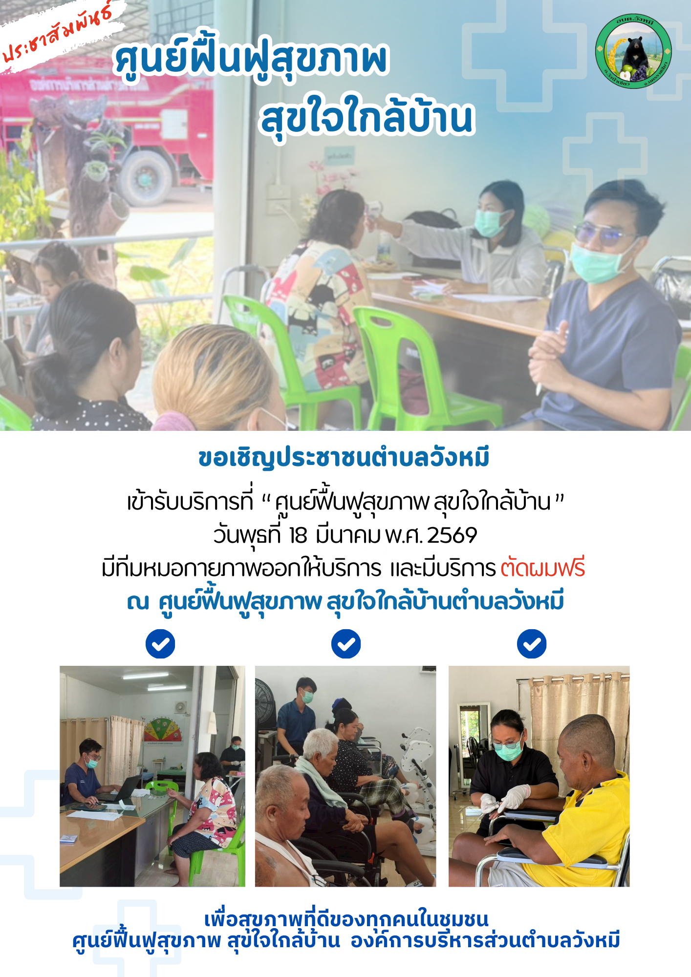 ขอเชิญประชาชนตำบลวังหมี เข้ารับบริการที่ “ศูนย์ฟื้นฟูสุขภาพ สุขใจใกล้บ้าน” ในวันพุธ ที่ 18 มีนาคม พ.ศ.2569 |