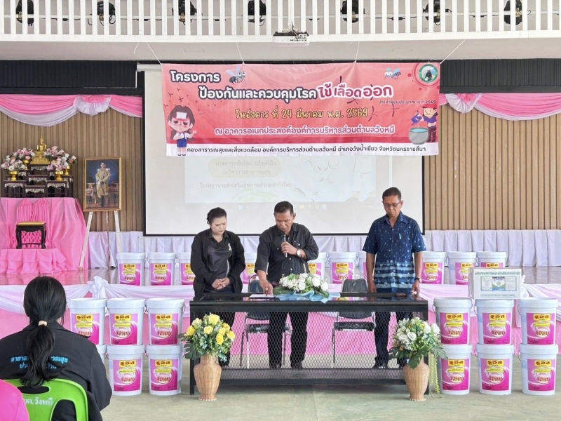 นายสำเริง รักษา นายกองค์การบริหารส่วนตำบลวังหมี พร้อมด้วยคณะผู้บริหารและเจ้าหน้าที่องค์การบริหารส่วนตำบลวังหมี ร่วมดำเนินงานตามโครงการป้องกันและควบคุมโรคไข้เลือดออกประจำปีงบประมาณ พ.ศ. 2569 โดยกองสาธารณสุขและสิ่งแวดล้อมองค์การบริหารส่วนตำบลวังหมี ณ อาคารอเนกประสงค์องค์การบริหารส่วนตำบลวังหมี