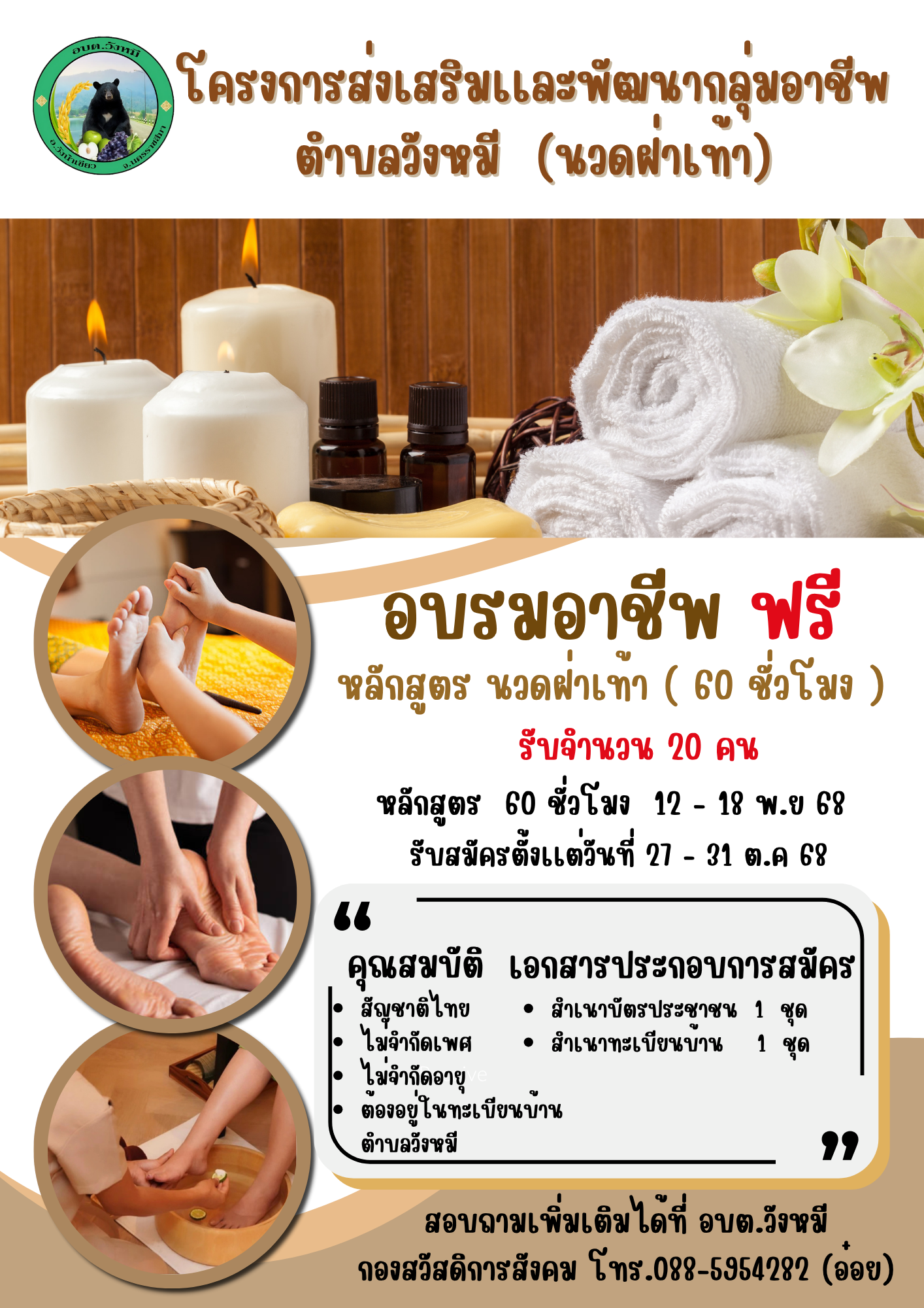 เปิดรับสมัครเข้าร่วมอบรม โครงการส่งเสริมและพัฒนากลุ่มอาชีพตำบลวังหมี (นวดฝ่าเท้า) |