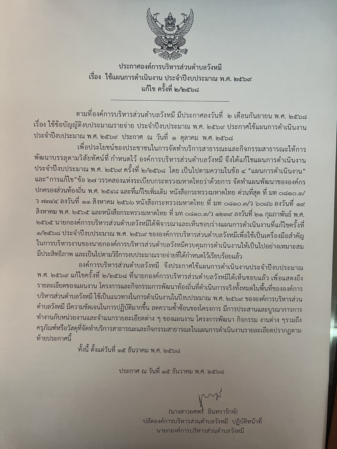 ประกาศองค์การบริหารส่วนตำบลวังหมี เรื่อง ใช้แผนการดำเนินงาน ประจำปีงบประมาณ พ.ศ.2569 แก้ไข ครั้งที่ 2/2568